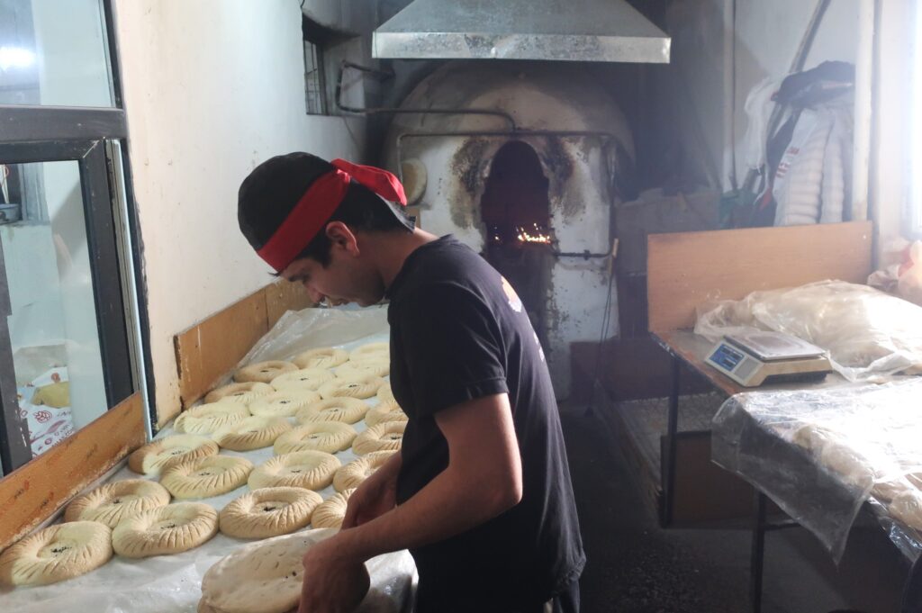 We come across a bakery hard at work producing loaves of non – cognate with ‘naan‘– bread.