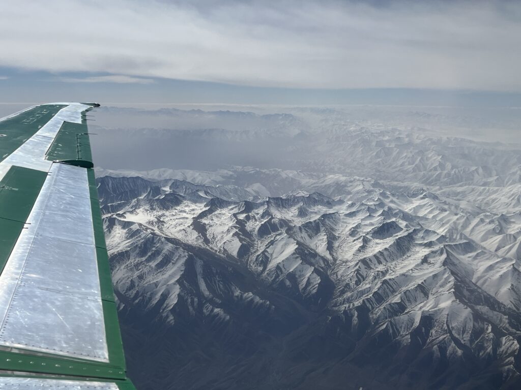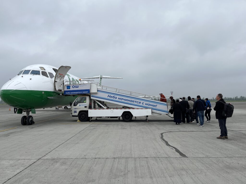 We opt to fly to Bishkek, the capital, rather than undergo a twelve-hour bus ride. At first we think we’re getting onto a Russian-built aircraft, because we don’t recognize the model as anything we’ve seen before.