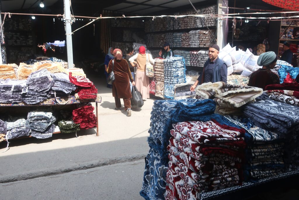 There isn’t much here for the souvenir-seeking tourist. It’s mostly cheap wholesale goods. A small rug in a window catches our eye, a sort of roughly-made, folk-art-y kind of thing.