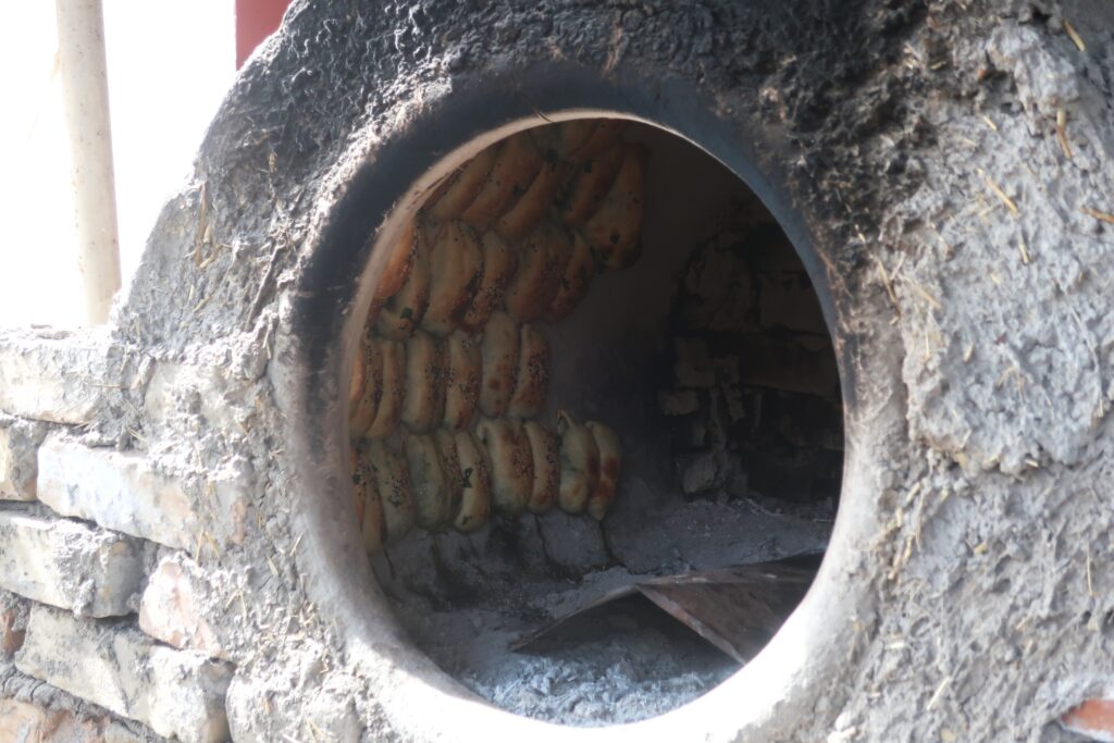 Some samsas baking in a tandor oven. The freshly-made samsas are slapped onto the sides of the oven and peeled off when done.