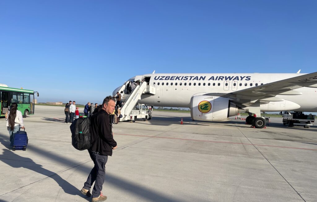 Our plan is to fly back to Tashkent and take an overnight train to Termez, far to the south. Economy seats are sold out, so we’re forced to fly Business Class.